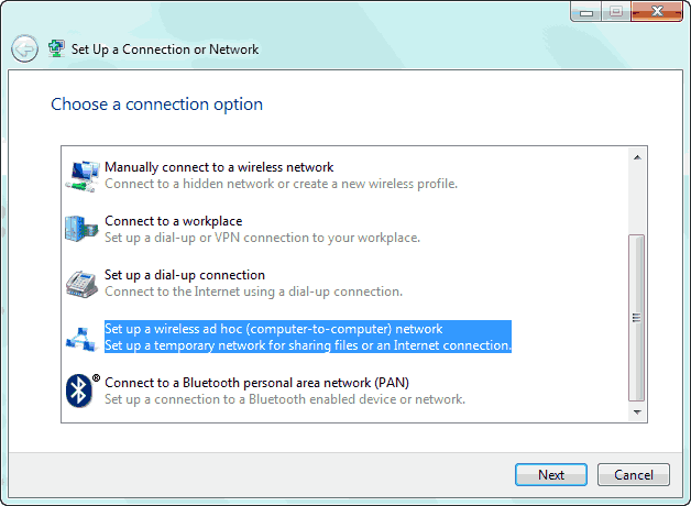 3. Now in the window that pops up, select the “Set up a wireless ad hoc network” option.